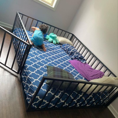 Twin Size Metal Floor Bed Frame with Fence and Door, Black-ModernLuxe