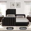 Make a dramatic style statement with this luxurious velvet platform bed featuring a vertical channel-tufted headboard and matching footboard. The opulent upholstered frame is trimmed with elegant nailhead accents, creating a focal point for bedrooms. Designed for Queen and King mattresses, the sturdy wooden slat system provides excellent support without needing a box spring. The sumptuous velvet fabric offers tactile luxury while the padded headboard ensures comfortable back support. Easy assembly with all tools included completes this premium bedroom upgrade.