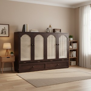 This Queen Size Murphy Bed transforms seamlessly from an elegant cabinet to a comfortable sleeping space, featuring a handwoven rattan panel that adds organic texture to your decor. The built-in charging station (2 outlets + 2 USB ports) remains accessible in both configurations for convenient device charging. Crafted from premium pine wood, its reinforced frame with locking legs ensures stability, while the spacious wheeled drawer offers hidden storage. Perfect for guest rooms or small spaces, the vertical fold-up design maximizes floor area without compromising style. Includes all hardware for straightforward assembly. A perfect blend of vintage charm and modern functionality that keeps your space organized and tech-ready.