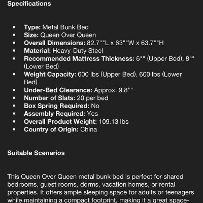 This Queen Over Queen metal bunk bed is perfect for shared bedrooms, guest rooms, dorms, vacation homes, or rental properties. It offers ample sleeping space for adults or teenagers while maintaining a compact footprint, making it a great space-saving solution for modern living spaces. Notes