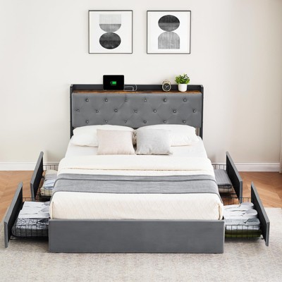 Queen Size Bed Frame with 4 Storage Drawers and Headboard with Charging Station,2 Tier Solid Wood Headboard Storage,Strong Wood Slats Support