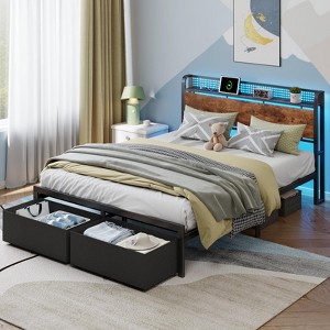 Queen Size Bed Frame with Charging Station LED Lights 2 Storage Drawers Storage Headboard Platform Bed No Box Spring Needed