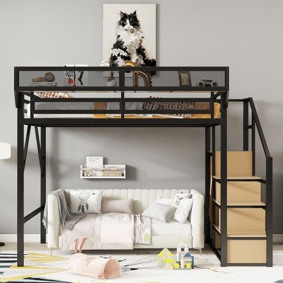 Queen Size Loft Bed with Ladder Metal Queen Loft Bed with Storage Shelves High Loft Bed for Kids Teens Black