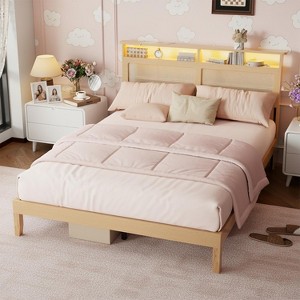 Queen Size Platform Bed Frame with Storage Headboard Charging Station LED Lights Natural Wood Rattan Under Bed Storage No Box Spring