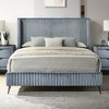 - Sumptuous Wide Wale Corduroy Upholstery The Mavela bed features luxurious wide wale corduroy upholstery in a soothing blue hue, offering a soft, plush texture that elevates comfort and adds a sophisticated touch to your bedroom decor.