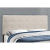 - Low profile queen bed frame upholstered in a beautiful beige linen look fabric; padded headboard boasts an elegant tufted design