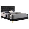 - Modern glam panel bed features plush black velvet upholstery on the foam padded headboard and sides, creating a luxurious bedroom centerpiece