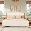 - This contemporary bed is upholstered in premium white boucle fabric, offering a soft, textured surface that exudes elegance and comfort.