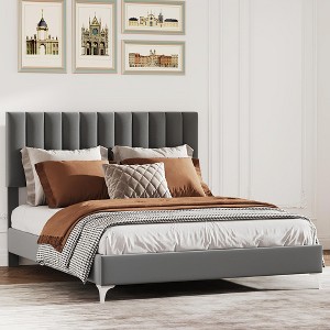 This bed frame features a 3-level adjustable headboard upholstered in soft velvet with a stylish vertical stripe design. Crafted from durable metal and wood, it supports up to 800 lbs and includes noise-reducing slats for a quiet sleep. No box spring is needed, and easy assembly makes setup quick and stress-free.