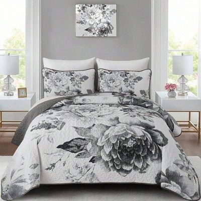 Queen Size White Floral Bed Spread with Black Botanical Pattern Boho Quilt Set, Soft Microfiber, Lightweight, 2 Pillow Cases
