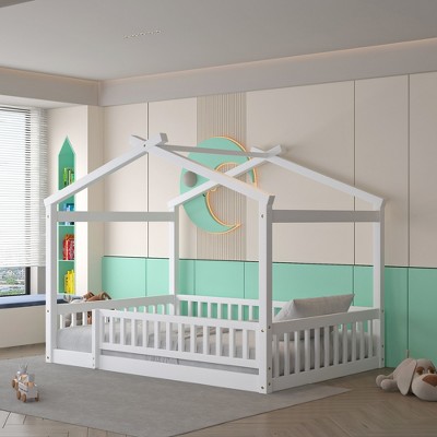 Queen Size Wood Floor Bed Frame with Fence and Door