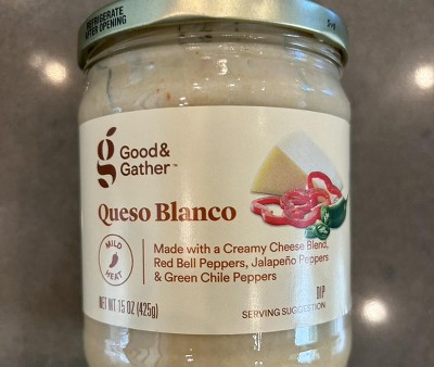 Set out a tasty appetizer or late-night snack with a handful of crispy tortilla chips dipped in the gooey, cheesy Queso Blanco Dip from Good & Gather™. A creamy dip with a mildly spicy blend of red bell peppers, jalapeno peppers and diced green chile peppers, this spicy and creamy queso is made with a creamy cheese blend for rich, flavorful taste. Great for dipping chips, veggies or pretzels or topping burritos or nachos, this queso also makes a perfect addition to many chicken and beef dishes. Whether served with appetizers in between meals or as a creamy side dish, you'll find yourself wanting to add this spicy queso to just about everything!
