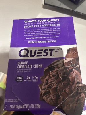 - YOU DESERVE A SPECIAL TREAT: The Quest Double Chocolate Chunk Protein Bars provide double the chocolate for all the chocolate lovers out there. Best of all, our bar has 20g protein, 4g net carbs and less than 1g of sugar per bar.