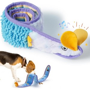 Dental Health: The mop velvet fabric is beneficial for your dog's dental health. This kind of fabric helps clean their teeth while they chew and play. Built to Last: Double reinforcement and strong stitching ensure it's durable and can withstand the enthusiasm of chewing. Even it's a no stuffing dog toy, we still recommend closely monitoring aggressive chewers to prevent them from pulling out the squeakers during vigorous play. Interactive Play: The total length of the eel is 31.1 inches, it's a cute dog toy for small, medium, and large dogs. With its strong, elongated body, it is perfect for interactive play like tug-of-war. Are your dogs ready to challenge even the toughest friends to a friendly match. Mental & Physical Exercise: This snuffle dog toy takes treat time to the next level. With hidden treat pockets in 3 sizes and velcro design, dogs must explore and untie the eel to reveal hidden treats. This dog puzzle dog toy encourages foraging instinct training and snuffle training, turning mealtime into a mentally stimulating challenge. Squeaky & Crinkly Fun: The no stuffing eel dog squeaky toy features 3 built-in squeakers and crinkle paper, adding delightful sounds to playtime. This small dog toy not only keeps your dogs busy for hours but also helps alleviate boredom and anxiety.