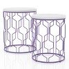 Vibrant colors set the tone for this (set of 2) modern nesting accent tables. Each with a drum silhouette, the tables feature open trellis metalwork in a colorful finish, topped with a round tabletop in white. The smaller table fits within the larger to free up floor space when needed. This set offers versatile function and exemplary style to boost your living area or bedroom decor.