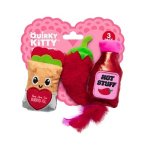 For a purrfect play date bring home the new Quirky Kitty™ You Are Burrito-ful 3-pack! Understanding your cat’s natural instincts is essential in forging a strong bond with your pet. Both fun and functional, Quirky Kitty™ serves as a helpful tool in choosing the best cat toys when shopping for your pet. Quirky Kitty™ durable plush cat toys are the purrrfect tool for exercising and entertaining house cats, ferrets, and other small domestic pets. Special crinkle-paper inside captures kitty’s attention by creating a sound all cats love. Filled with aromatic North American catnip that attracts cats to play! This quirky trio includes a cuddly plush burrito, a super soft hot chili pepper, and a shiny cute hot sauce to bat and chase! Your kitty will feel the love with the new Quirky Kitty™ You Are So Burrito-ful 3-pack this Valentines Day!
