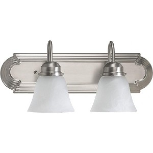 Material: Glass, Finish Color: Satin Nickel, Width: 18", Height: 8", Depth: 7.75", Number Of Bulbs: 2, Wattage: 100 Watts, Dimmable: No, Moisture Rating: Damp Rated, Desc: This classic vanity light design includes a few updated features. A Satin Nickel finish and clear seeded bell-shaped glass shades give this washroom luminary a modern appeal. The back plate sports the same classic design with decorative fastening knobs. Give your bathroom mirror a fresh new look with this two-light vanity. Shade Included: Yes. ,