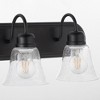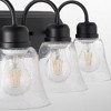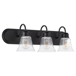 Material: Glass, Finish Color: Noir, Width: 24", Height: 8", Depth: 7.75", Number Of Bulbs: 3, Wattage: 100 Watts, Dimmable: No, Moisture Rating: Damp Rated, Desc: This classic vanity light design includes a few updated features. A Satin Nickel finish and clear seeded bell-shaped glass shades give this washroom luminary a modern appeal. The back plate sports the same classic design with decorative fastening knobs. Give your bathroom mirror a fresh new look with this three-light vanity. Shade Included: Yes. ,
