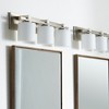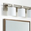 Material: Glass, Finish Color: Satin Nickel, Width: 24", Height: 7.5", Depth: 6", Number Of Bulbs: 3, Wattage: 100 Watts, Dimmable: No, Moisture Rating: Damp Rated, Desc: Add a sleek luminary to your washroom ensemble. This classic vanity light design includes a few updated features. A Satin Nickel finish and clear seeded glass shades give this luminary a modern appeal, with a touch of elegance. The back plate sports the same classic finish with dual layer mount. Fit for 100W medium base bulbs for an ambient glow. Give your bathroom mirror a fresh new look with this three-light vanity. Shade Included: Yes. ,