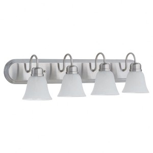 Material: Glass, Finish Color: Satin Nickel, Width: 30", Height: 8", Depth: 7.75", Number Of Bulbs: 4, Wattage: 100 Watts, Dimmable: No, Moisture Rating: Damp Rated, Desc: This classic vanity light design includes a few updated features. A Satin Nickel finish and clear seeded bell-shaped glass shades give this washroom luminary a modern appeal. The back plate sports the same classic design with decorative fastening knobs. Give your bathroom mirror a fresh new look with this four-light vanity. Shade Included: Yes. ,