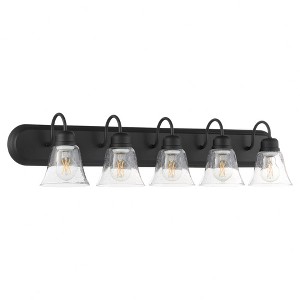 Material: Glass, Finish Color: Noir, Width: 36", Height: 8", Depth: 7.75", Number Of Bulbs: 5, Wattage: 100 Watts, Dimmable: No, Moisture Rating: Damp Rated, Desc: This classic vanity light design includes a few updated features. A Satin Nickel finish and clear seeded bell-shaped glass shades give this washroom luminary a modern appeal. The back plate sports the same classic design with decorative fastening knobs. Give your bathroom mirror a fresh new look with this five-light vanity. Shade Included: Yes. ,