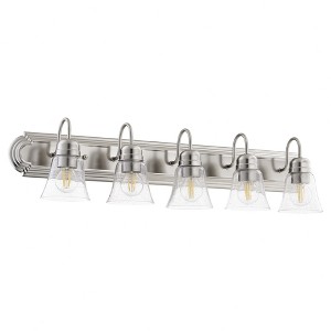 Material: Glass, Finish Color: Satin Nickel, Width: 36", Height: 8", Depth: 7.75", Number Of Bulbs: 5, Wattage: 100 Watts, Dimmable: No, Moisture Rating: Damp Rated, Desc: This classic vanity light design includes a few updated features. A Satin Nickel finish and clear seeded bell-shaped glass shades give this washroom luminary a modern appeal. The back plate sports the same classic design with decorative fastening knobs. Give your bathroom mirror a fresh new look with this five-light vanity. Shade Included: Yes. ,