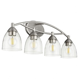 Introducing the Barkley Collection by Quorum Lighting. This stunning fixture features a sleek Satin Nickel finish, adding a touch of modern elegance to any space. With a width of 29" and a height of 9.75", it is the perfect size to make a statement without overwhelming the room. The depth of 6.25" ensures a compact design that fits seamlessly into any decor. With four bulbs and a wattage of 100 Watts, this fixture provides ample lighting for any room. The included shade adds a touch of sophistication and softens the light for a warm and inviting ambiance. Although not dimmable, this damp rated fixture is suitable for use in bathrooms and other moisture-prone areas. Elevate your space with the Barkley Collection from Quorum Lighting.