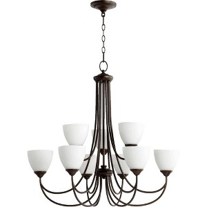 Introducing the Brooks 9-Light Chandelier by Quorum Lighting. This stunning chandelier from the Brooks collection is the perfect addition to any home. With its oiled bronze finish, it adds a touch of elegance and sophistication to any space. The chandelier measures 32" in width and 32" in height, making it a statement piece in any room. It features a classic incandescent lamping type, with 9 bulbs that can accommodate up to 60 watts each. The satin opal shade color adds a soft and inviting glow to your space. This chandelier is damp rated, making it suitable for use in bathrooms or other moisture-prone areas. Elevate your home decor with the Brooks 9-Light Chandelier by Quorum Lighting.