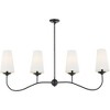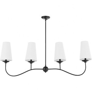 Collection: Euphora, Finish Color: Matte Black, Width: 10", Height: 19", Length: 50", Hanging Method: Stem, Lamping Type: Incandescent, Number Of Bulbs: 4, Wattage: 240 Watts, Moisture Rating: Damp Rated, Desc: Sweeping curves and classic tapered drum white linen shades unite, creating a striking display of transitional charisma in the Eurphora series of lighting. The artistry of the Euphora 4 light linear pendant is evident in the soft contour of a slender frame finished in midnight bronze. Adorn your kitchen or dining space with the elegance of the Eurphora. Requires 4 - 60 Watt / Candelabra Base Bulbs / Removable White Linen Shade / Damp Listed / Height adjustable with 2-8", 2-12", 3-16" stems included. ,