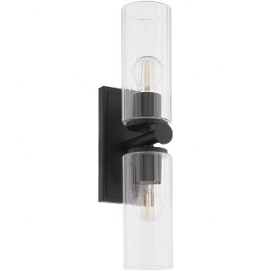 Collection: Juniper, Material: Glass, Finish Color: Matte Black, Width: 4.75", Height: 20", Depth: 6", Height From Outlet Box: 10", Backplate Width: 4.75", Backplate Length: 9", Lamping Type: Incandescent, Number Of Bulbs: 2, Wattage: 100 Watts, Moisture Rating: Damp Rated, Desc: Tamara�s first home to air on Bargain Mansions was Juniper. She and her father worked on this home together, and at the end of the build, her father purchased the home. This home�s French chateau design and masculine feel inspired the Juniper collection of linear pendants, wall mounts, vanity lights, and chandeliers. Cylindrical discs details elevate classically shaped arms in the Juniper vanity lights and wall mounts. Slender, clear glass shades echo the silhouette of the frame, supporting a clean, luxurious tone. Wall mount options of 1 or 2 light arrangements and an aged brass or matte black finish provides flexibility for your dining room, home office, or hallway designs.,