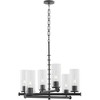 Collection: Juniper, Material: Glass, Finish Color: Matte Black, Width: 26", Height: 26", Hanging Method: Chain, Lamping Type: Incandescent, Number Of Bulbs: 6, Wattage: 360 Watts, Moisture Rating: Damp Rated, Desc: Tamara�s first home to air on Bargain Mansions was Juniper. She and her father worked on this home together, and at the end of the build, her father purchased the home. This home�s French chateau design and masculine feel inspired the Juniper collection of linear pendants, wall mounts, vanity lights, and chandeliers. Cylindrical discs divide the stem into equal segments that lead to overlapping arms. Each arm supports two candelabra bases housed by slender, clear glass shades. The layered design of the Juniper chandelier offers a unique experience from every angle. Choose from aged brass or matte black in 6 or 8 light arrangements for a perfect fit into your living room, dining room, or bedroom.,