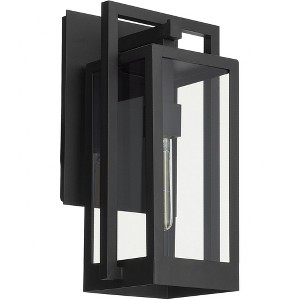 Collection: Marco, Finish Color: Textured Black, Width: 9.5", Height: 18.25", Depth: 8.75", Lamping Type: Incandescent, Number Of Bulbs: 1, Wattage: 100 Watts, Moisture Rating: Wet Rated, Desc: Interloping rectangles in a matte black finish allow the Marco family of lights an enhanced edge on style, while coastal grade materials provide the ability to weather the elements. Geometric intrigue coupled with a sturdy build add comfort and style to any patio or front door area. Requires 1 - 100 Watt / Medium Base Bulb / Clear Glass Shade / Costal Grade / Wet Listed. ,