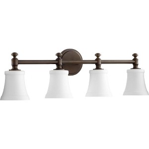 Introducing the Rossington Collection by Quorum Lighting. Crafted with high-quality glass and finished in a stunning oiled bronze color, this 30" wide, 9" tall, and 6" deep fixture is a perfect addition to any space. With 4 bulbs and a wattage of 100 Watts, it provides ample lighting. The shade is included, adding a touch of elegance. Although not dimmable, this damp rated fixture is suitable for various environments. Trust Quorum Lighting for exceptional quality and style.