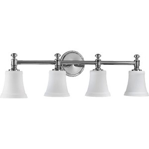 Collection: Rossington, Material: Glass, Finish Color: Chrome, Width: 30", Height: 9", Depth: 6", Number Of Bulbs: 4, Wattage: 100 Watts, Dimmable: No, Moisture Rating: Damp Rated Desc: Shade Included: Yes. , Material: Glass, Finish Color: Chrome, Width: 30", Height: 9", Depth: 6", Number Of Bulbs: 4, Wattage: 100 Watts, Dimmable: No, Moisture Rating: Damp Rated