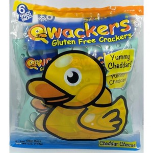 Qwackers Crackers are duck-shaped, gluten-free snacks made with real cheese. Qwackers are gluten-free, peanut-free, corn-free, soy-free, sugar-free and artificial-free. School-safe and allergy-friendly, they are the perfect choice for lunchboxes, snack time, or on-the-go munching. With a craveable crunch and fun shape kids love, Qwackers make snack time something everyone can enjoy.