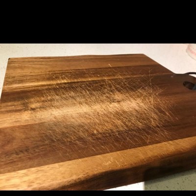- This rustic-styled wood cutting board is crafted from sustainable acacia wood and boasts stunning exposed woodgrain