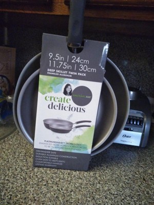[This review was collected as part of a promotion.] I received the Pots and Pans - Skillet Twin Pack, Gray with Light Blue Handles and I just love them. They are a very amazing product for people who are trying to cut back on using oils. The Pots and Pans - Skillet Twin Pack, Gray with Light Blue Handles are great for cooking grilled cheese, burgers, eggs, pancakes , bacon sausage and many other things with out them sticking to the pan. The Pots and Pans - Skillet Twin Pack, Gray with Light Blue Handles has has platinum shield technology , that is inhanced black non-stick reinforced to be 9 times harder than titanium and is 2times harder than stainless steel. The Pots and Pans - Skillet Twin Pack, Gray with Light Blue Handles is oven safe up to 400 degrees Fahrenheit so it is great for baking cinnamon rolls, cookies cakes and backing meats, veggies and much more. It comes with a 9.5 inch 24cm skillet and a 11.75 inch 30. Cm pan . You can cook dinner or breakfast with just these two cars pans . I cooked sausage and bacon in the small one and 4to five pancakes in the bigger one and then the eggs after I took out the pancakes .* TIPS To know: 1. When scrambling or frying food in these pans be sure not to use sharp objects like forks or knives so you don't scratch the pan up. 2. Scratching the pan can cause it not to work properly anymore. 3. Pans are not broiler safe or dishwasher safe.