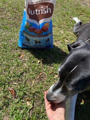 The Nutrish Large Breed Real Beef, Pea, Carrot, and Brown Rice recipe has received positive feedback from guests, highlighting its appealing taste and quality ingredients. Many guests noted improvements in their dogs' energy levels and coat health after switching to this food. However, some guests experienced digestive issues, particularly with smaller kibble sizes. Overall, it is a nutritious option for large breed dogs, especially those with picky eating habits.