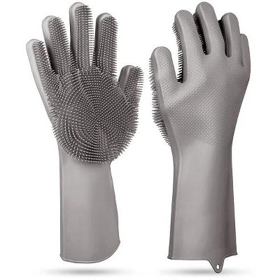 **FOOD-GRADE SILICONE GLOVES*:Made from food-grade silicone materials,our gloves are non-toxic,odorless,skin-friendly,sturdy,tough,waterproof,oil-resistant and high-temperature resistant(up to 160¡æ/320¨H). **STRONG CLEANING PERFORMANCE*:Separate 5 fingers to increase cleaning flexibility. At one side of the gloves is filled with .2inches-length(finger part)//0.4inches-length(palm part) thick and soft silicone bristles and at the other side of the gloves overspreads non-slip round points to effectively remove residuals. **KEEP YOUR HANDS SAFE*:Doing cleaning work with our 13inches-length gloves not only speed up your cleaning time,but also keep your hands far away the hurt of various detergents. Besides,at the inside of our gloves overspreads round points to prevent the gloves slipping from your hands. **MULTI-PURPOSE*:Our gloves are a best helper no matter you are doing vegetable and fruit washing,kitchenware washing,bathroom cleaning,car washing and pet grooming,pet bathing or serving hot dishes and taking out oven foods. **EASY TO CLEAN*:With the feature of oil-resistant and high-temperature feature,our food-grade silicone gloves can be washed easily and sterilized in boiling water. And you can hang it to dry or organize with its coming hole after cleaning.