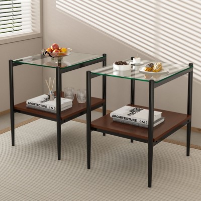 1.Packing: 2 pcs /ctn 2.Item Dimensions:17.72"L x 17.72 "W x 20.5 "H, Load-bearing capacity: 150lbs 3.Made of tempered Glass and metal leg, the tempered glass thickness of 6m (top) and 5mm (bottom) provides high capacity of 150lbs. 4.The upper layer is made of transparent tempered glass, and the lower layer is made of frosted tempered glass, which is fashionable and beautiful. 5.Elegant design: The tempered glass top provides not only a chic look but also a durable and sturdy surface for placing items. 6.Versatile use: The minimalist design is perfect for a wide range of settings, adding a touch of sophistication to any space, such as living room, bedroom. 7.Easy to clean: If you want to save time on cleaning your table, this is an excellent option. Glass tables are particularly easy to maintain; all you need is a quick wipe down. 8.Easy to assemble: All hardwares and accessories are provided. It comes with easy-to-follow instructions.