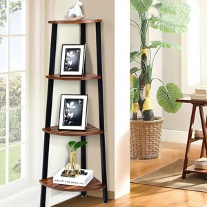 - Industrial and Stylish Style: Featuring brown and sliver/white color, the 4 tiers' corner shelf has simple lines and an industrial design. The T-type design is very considerate and adds a sense of artistic beauty to your home. What's more, this open design increases the flow of air. Placing the shelf in the corner can give the room more ornamental elements.
