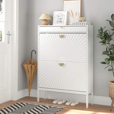 Measuring 31.5"W x 13.78"D x 26.77"H, this modern shoe cabinet comfortably stores 12¨C16 pairs of shoes. Its adjustable interior shelves accommodate footwear of varying heights, while the spacious tabletop and practical drawer offer space for displaying decor and organizing small essentials like keys or shoelaces. Ideal as an entryway organizer, living room sideboard, or compact TV stand. Elegant Design, Lasting Durability Featuring refined herringbone-pattern panels and smooth rounded knobs, this piece blends rustic charm with minimalist versatility. Built from commercial-grade laminate with a reinforced base and anti-tipping safety features, it offers sturdy, worry-free storage that keeps shoes orderly and dust-free¡ªtransforming cluttered spaces into tidy, stylish areas.