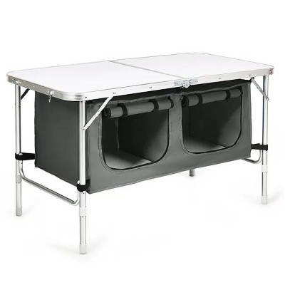 Overview The foldable design and compact size make the tables very easy to carry and transport. If you are looking for a table like that, don't hesitate to buy it. Foldable design simplifies the installation process 2 different heights are available Light weight and compact size make it easy to carry and store Triangular structure and reinforced beams enhance the load-bearing capacity Premium aluminum and wear-resistant Oxford cloth to extend the service life Large capacity lockers can be used to store large quantities of food, tableware, etc Premium aluminum and strong structure enable it to bear up to 45lbs Waterproof surface simplifies the cleaning process Multi-purpose table for picnic, barbecue, party, camping