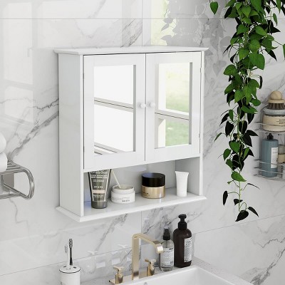 Racxily Over The Toilet Storage Cabinet, Freestanding Bath Organizer with Double Door, Open Shelves, White