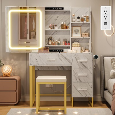 Smart Power & Styling Convenience: Comes with a built-in power socket and dedicated hairdryer holder, letting you use heated tools (flat/curling irons) and charge devices at the same time¡ªno more searching for outlets. Space-Saving Organized Storage: Features 1 large drawer, 2 small drawers, and open shelving with modular dividers to neatly store cosmetics, jewelry, and styling tools, keeping countertops clutter-free and items easy to reach. Professional LED Lighting for Flawless Makeup: 3 adjustable color temperature modes (warm/neutral/cool) simulate natural light, ensuring your makeup blends accurately and adapts to different skincare step needs. Luxury All-in-One Vanity Suite: Includes a matching upholstered stool, upgrading small bedrooms or dressing areas. It¡¯s also a thoughtful gift for birthdays, holidays, or special occasions. Quick & Easy Assembly: Detailed illustrated instructions, numbered panels, and an instructional video help you set up this vanity table in just 60-90 minutes¡ªno complex tools needed.