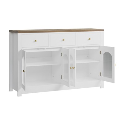 59.1" Farmhouse Sideboard with 3 Drawers & 4 Doors (White) Key Features: Maximize storage and style with this spacious 59.1-inch farmhouse sideboard, featuring a clean silhouette enhanced by sleek aluminum alloy handles. Offers versatile organization with three smooth drawers, four cabinet doors (one with a 3-position adjustable shelf), and two large open compartments for display. Crafted from high-quality, durable MDF with a refined White finish that resists warping and is easy to clean. Perfect as a buffet, entryway console, or living room storage piece. Material & Craft: Made from high-quality MDF with a refined White finish. Features sleek aluminum alloy handles, adjustable interior shelving, and a sturdy construction. Set includes: 1 x Sideboard, 3 x Drawers, 4 x Cabinet Doors, Adjustable Shelf.