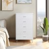 Drawer Size: 28" x 13" x 5"H This rectangular drawer chest combines sleek modern design with practical storage, making it a stylish and functional addition to any bedroom or living space. The chest is built with a sturdy wooden case-frame made from durable MDF and PB, ensuring long-lasting quality and stability. Featuring five spacious drawers, each equipped with side metal glide ball bearings for smooth operation, this piece offers ample storage for clothes, accessories, or household items. The chrome-finished metal legs add a touch of contemporary elegance and elevate the overall design, while the single handle on each drawer provides a minimalist yet functional hardware detail. With its smooth, manual-close drawers and safety stop feature, this chest combines convenience with style, offering both organization and a polished aesthetic to your space.