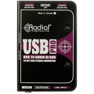 The Radial USB-Pro is a high-resolution stereo direct box designed to convert sound files from a laptop computer and seamlessly transfer them to a pair of balanced audio outputs to feed a PA, recording or broadcast mixing console. The USB-Pro automatically configures itself for use with all popular operating systems including Mac OSX, Windows XP, Vista and Windows 7, thus eliminating the need to load special drivers. Unlike devices that are limited with 16 bit, 44.1kHz conversion rates, the USB-Pro elevates the performance with true 24 bit, 96kHz stereo converters to deliver more headroom and greater detail. This eliminates the need for additional sound cards or separate converters when transferring files, further streamlining production in busy work environments. Connection from the laptop is done via the 'pro-audio standard ' USB type-B port. Digital-to-analog conversion is monitored with the built-in headphone amplifier to ensure the signal is being properly downloaded and converted. A mono-sum switch may be engaged to check for phasing or facilitate signal distribution to two outputs should this be preferred. One simply sets the output volume control to suit. Should hum or buzz caused by ground loops be encountered, two 'set & forget' side-access switches let insert isolation transformers into the signal path to block stray DC voltage offsets. To further reduce susceptibility to noise, this is augmented with a ground lift switch that lifts pin-1 on the two XLRs. As with all Radial products, the USB-Pro is designed to handle the rigors of professional touring. The unique book-end design creates protective zones around the switches, connectors and controls to keep them out of harm's way. Inside, Radial's time-tested I-beam construction assures the sensitive internal PC board will not torque which could otherwise cause premature part failure. Finally, a full bottom no-slip pad provides mechanical isolation and electrical insulation, further advantaging the user.