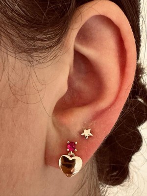 - Adorn your ears with these charming 14k yellow gold plated heart dangle earrings, embellished with sparkling round brilliant cut cubic zirconia stones delicate prong set atop each heart, exuding an irresistible allure that captures attention with every movement.