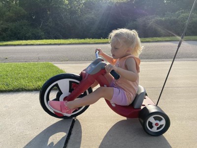 I received this product from radio flyer for free to try it out and test it. This is a level up compare to a tricycle, specially if your kids like to go fast. I like the feature of being able to switch out the seat as needed for height. My 3 year old did not enjoy it as much due to her feet not able to reach pedal easily even with the seat to the front. My 5 year old loved it. He loved how fast it can go and how easy it is to ride compare to a tricycle. It does take a few seconds to get the speed going. The big wheel definitely does not work on wood floors(I am sure it's not meant to be indoor toy). It is slippery on wood and takes a while to get it going. My kids did find it a little bit harder to go uphill. It's appropriate for 4 and up I would say. It does grow with the child and that's a money saver. Overall, we like this product and would recommend to add to your collection if your kids like racing.